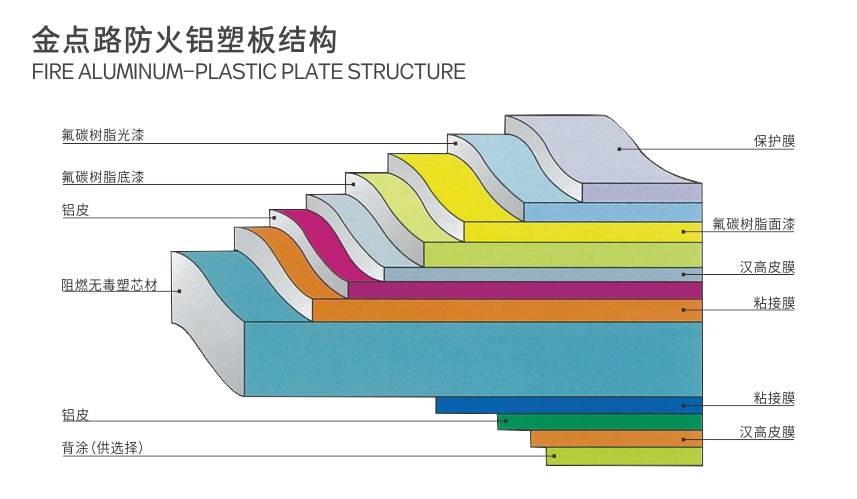 金點路A級防火鋁塑板是一種新型的高檔墻體裝飾及防火安全材料。它是由彩色涂層鋁板與無毒阻燃改性聚乙烯PE芯材與高分子粘接膜,經高溫復合而成的一種新型金屬塑料復合材料,廣泛應用于車站、碼頭、機場、影視劇院、體育館、商場寫字樓等。