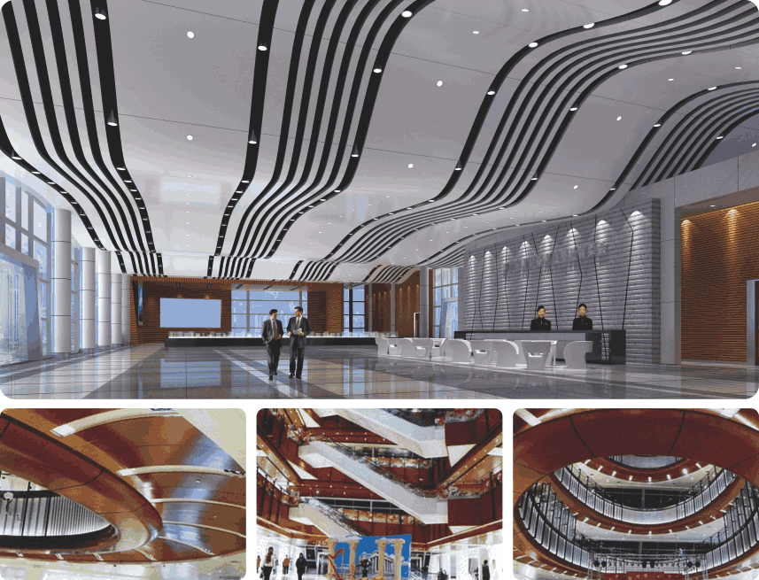 金點路鋁質天花板采用進口基材,從根本上解決傳統天花泛黃、變形等問題,金點路異型天花擁有獨特高新的設計理念,凸顯現代科技氣息,能根據各種環境要求,制造風格迥異的產品,將現代空間感體現得淋漓盡致。